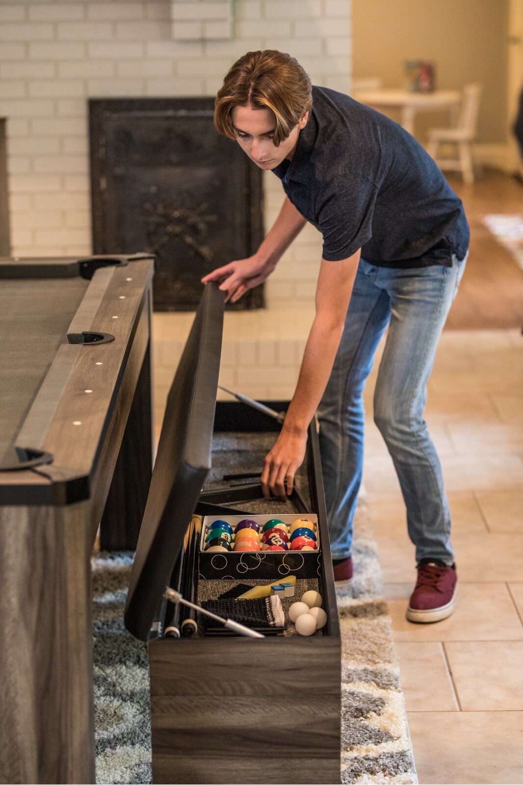 When room planning, account for five feet of space from the ends of the table, and three feet of space from the sides of the table, to allow for player movement.