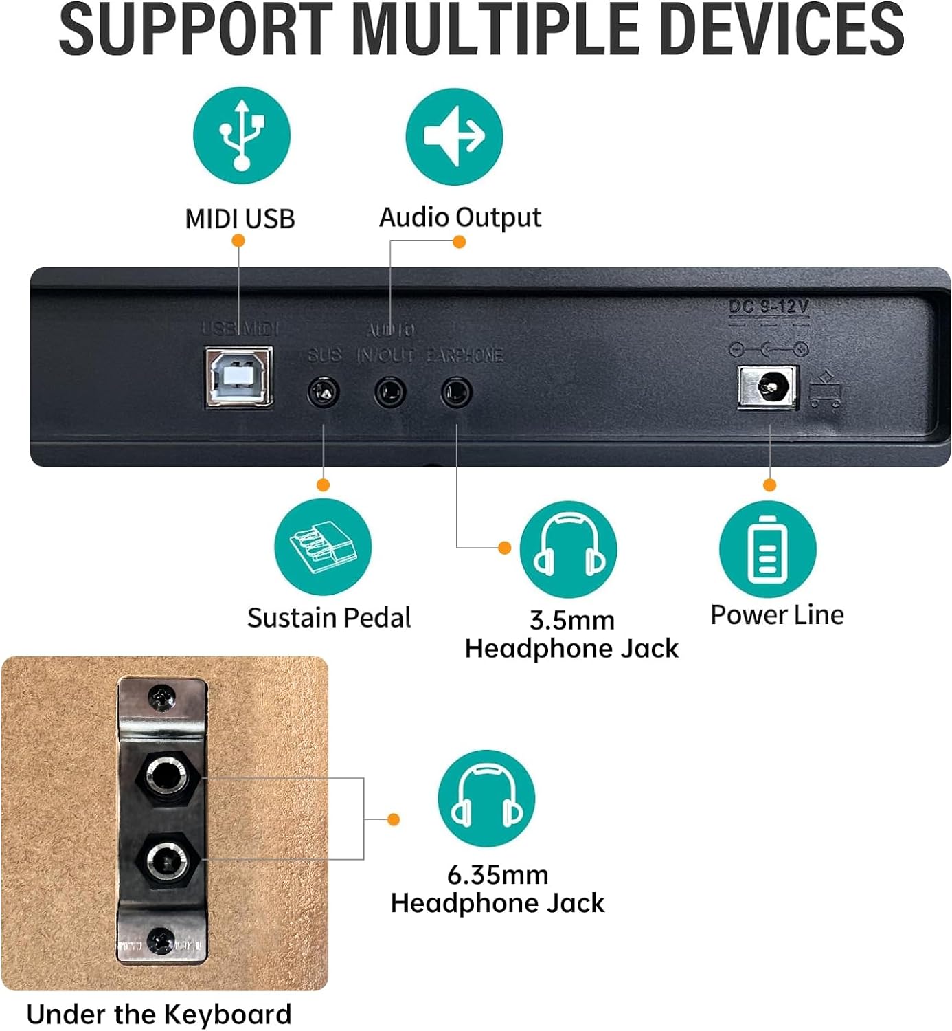 - 🎹【Outstanding Sound and System Features】Equipped with volume adjustment, multi-tone selection, recording control, playback function, split, teaching function, etc. Input for playing MP3, built-in amplifier, support for external speakers or headphones, suitable for different use scenarios.
