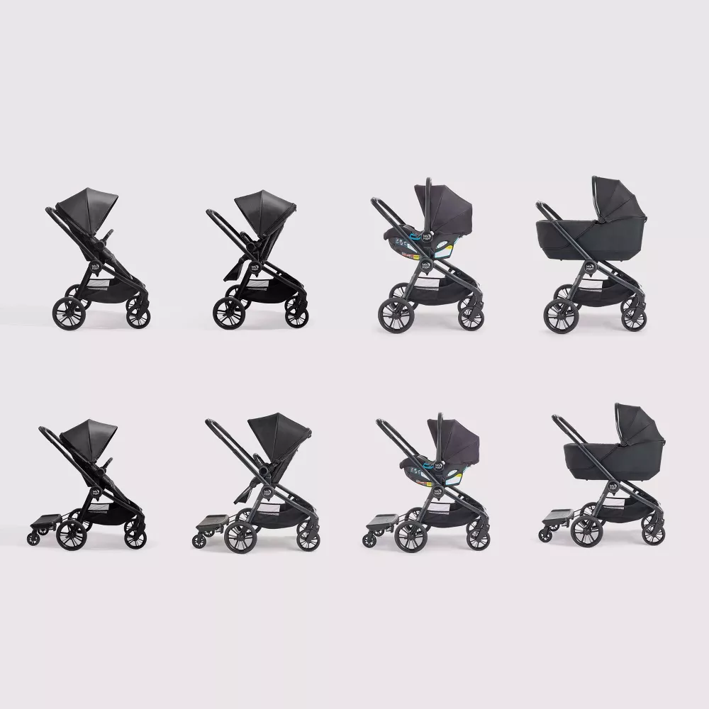Includes: Adjustable handlebar and belly bar with vegan leather accents; large UV 50+ canopy - Compatible with: Most Baby Jogger, Britax, Chicco, Clek, Cybex, Graco, Maxi-Cosi, Nuna, Peg Perego, and UPPAbaby infant car seats (adapters sold separately)