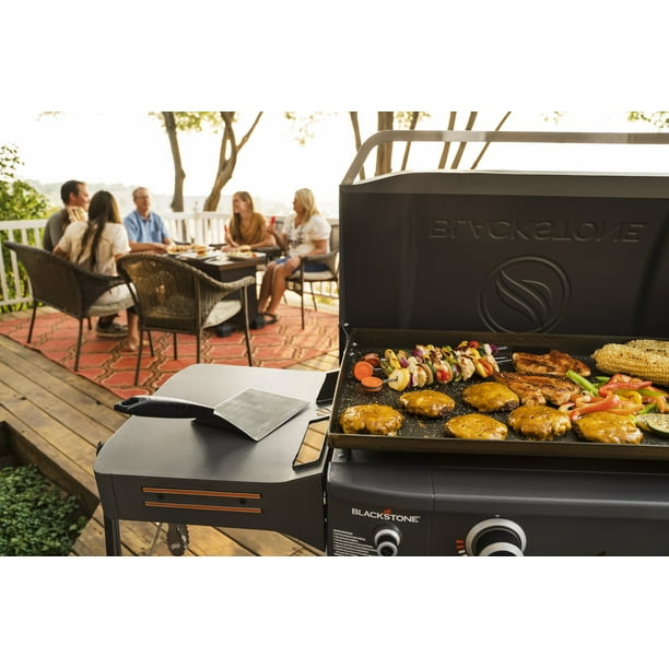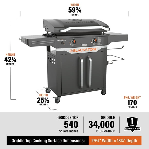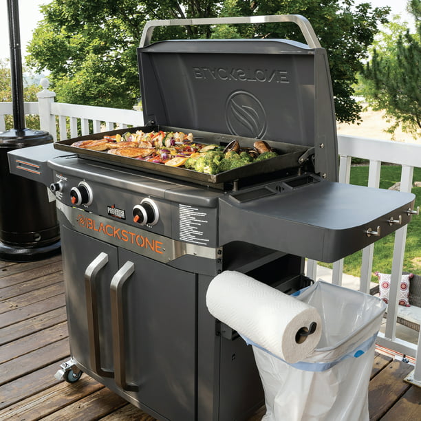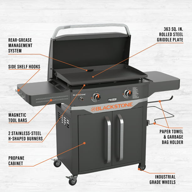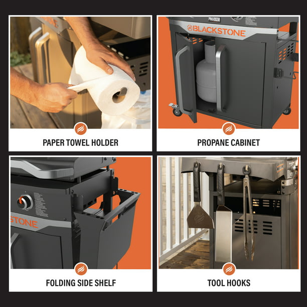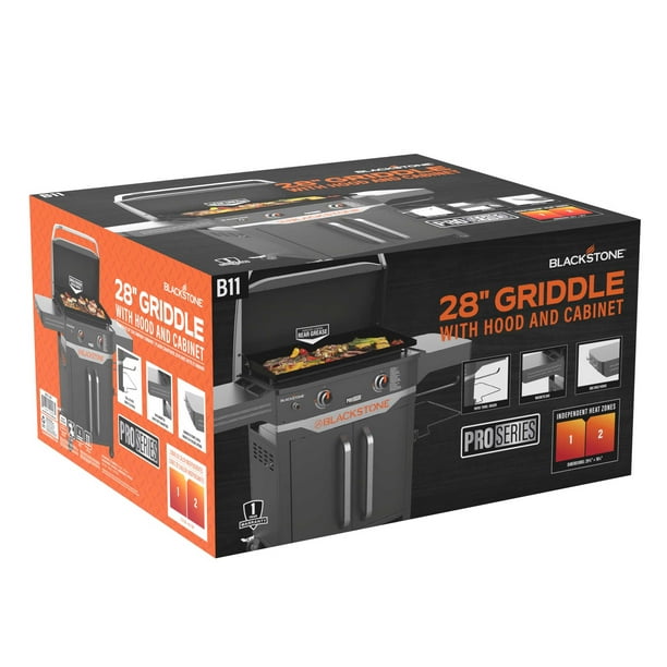 Griddle up a feast like a pro with the Blackstone ProSeries 2 Burner 28 Propane Griddle with Cabinet and Hood. Built-in hood for steaming smoking and cleanliness. Have everything you need at a single cooking station to save trips back inside or to the car. Hang your grilling tools on one side shelf with hooks and a magnetic bar while using the opposite side to hold paper towels and a waste bag. Store a gas tank and other safe items under the griddle in an enclosed area. Pair this griddle with other pieces from the Blackstone ProSeries collection or any professional Blackstone griddling tools to enhance your griddling experience.