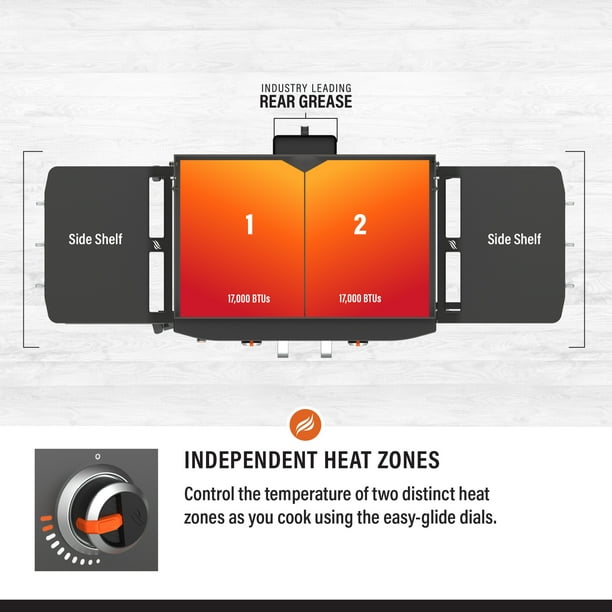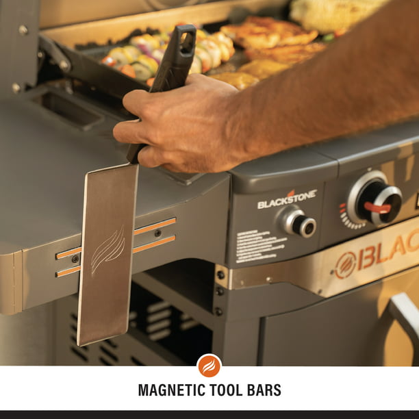 Side shelves give access to easy prep space and feature a magnetic tool bar and side shelf hooks for all your griddle tools. The side shelves can fold down to take up less space when not in use.