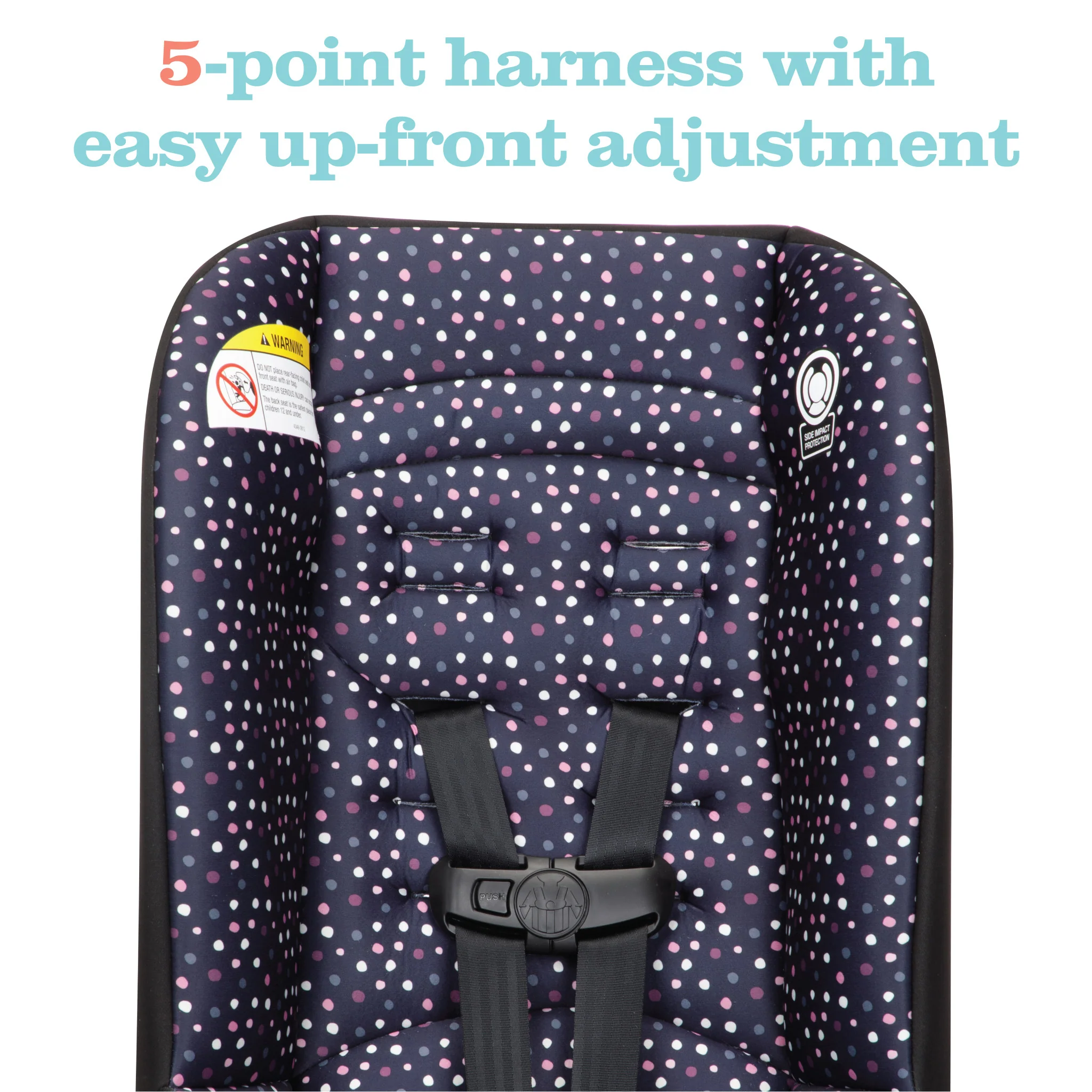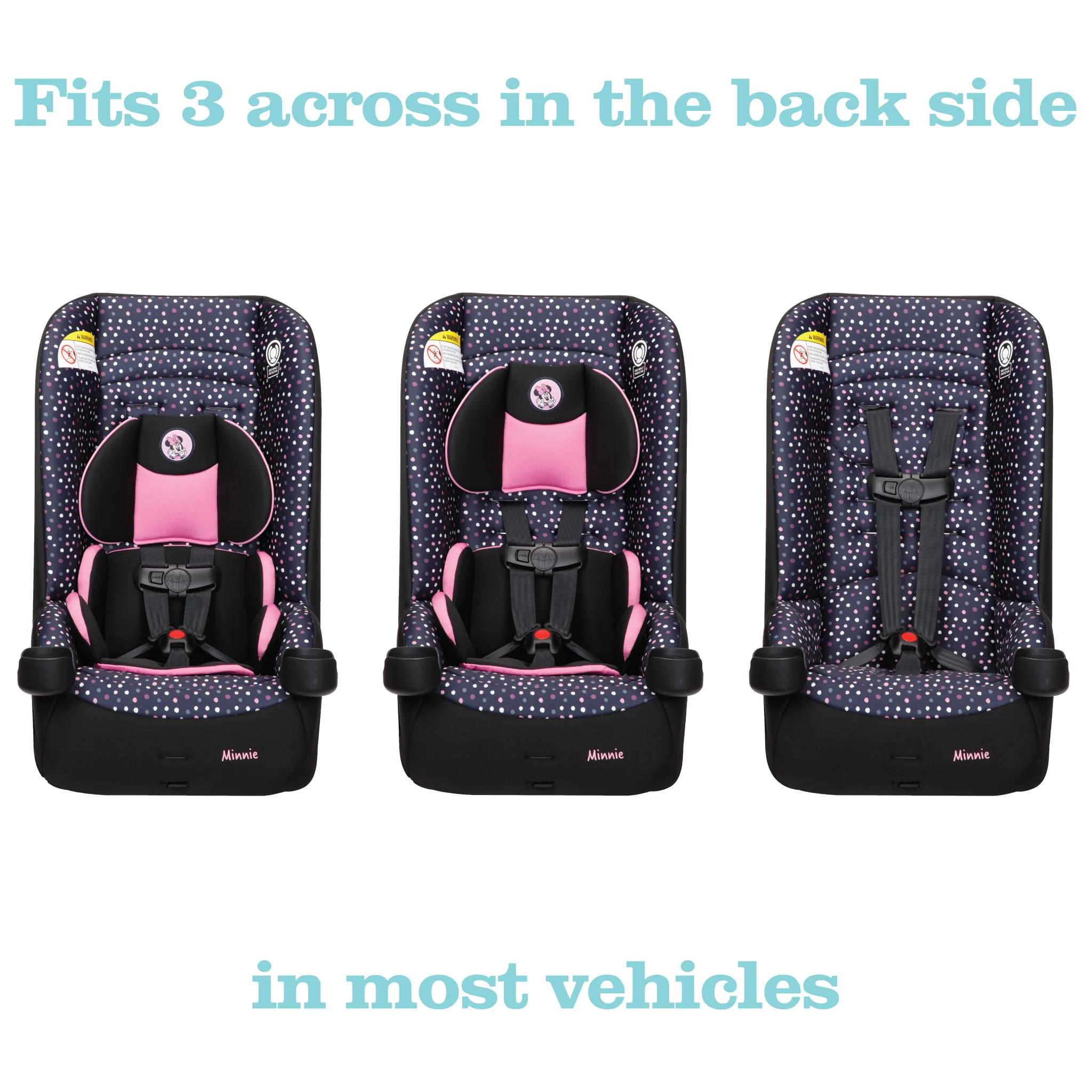 This 2-in-1 car seat is perfect for your growing family, too – fitting three across the back seat of most cars. The Disney Convertible Car Seat also puts your safety concerns at ease with the built-in side impact protection and 5-point harness.