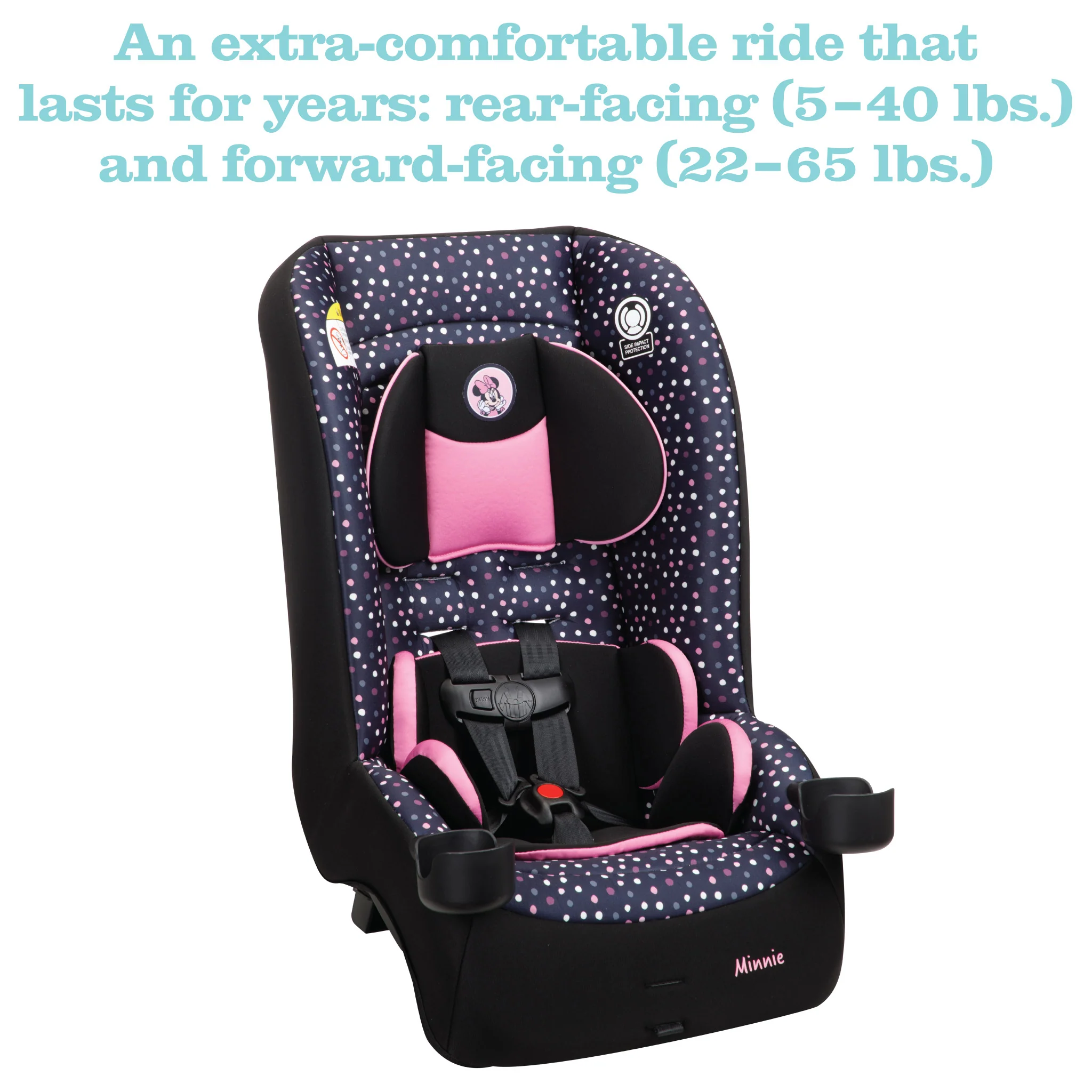 Traveling is super fun with Disney best friend along for the ride! This convertible car seat will keep your little one company with the comfort of an adorable Disney cushion. With its two modes of travel, your baby can ride comfortably rear facing from 5 to 40 pounds, and when the time comes, your "big kid" can ride forward facing up to 65 pounds.