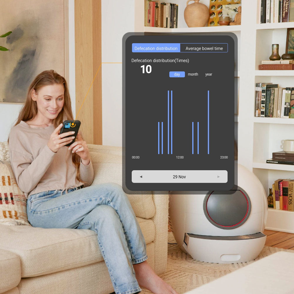 Record Toilet HabitsELS PET records each cat's toilet habits, providing valuable insights into their health and behavior. By tracking their bathroom routines, you can easily identify any irregularities or changes, ensuring prompt attention to potential health issues.Note: Operate via APP(2.4Ghz Wi-Fi Only) |