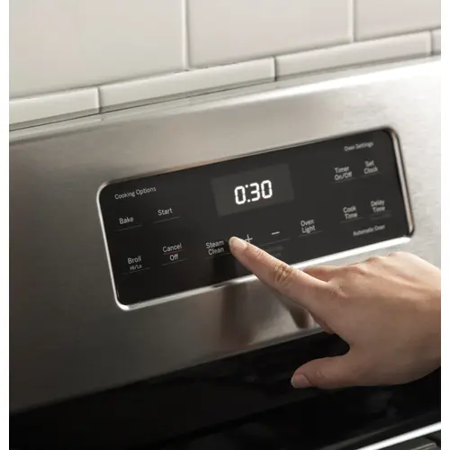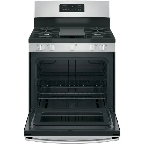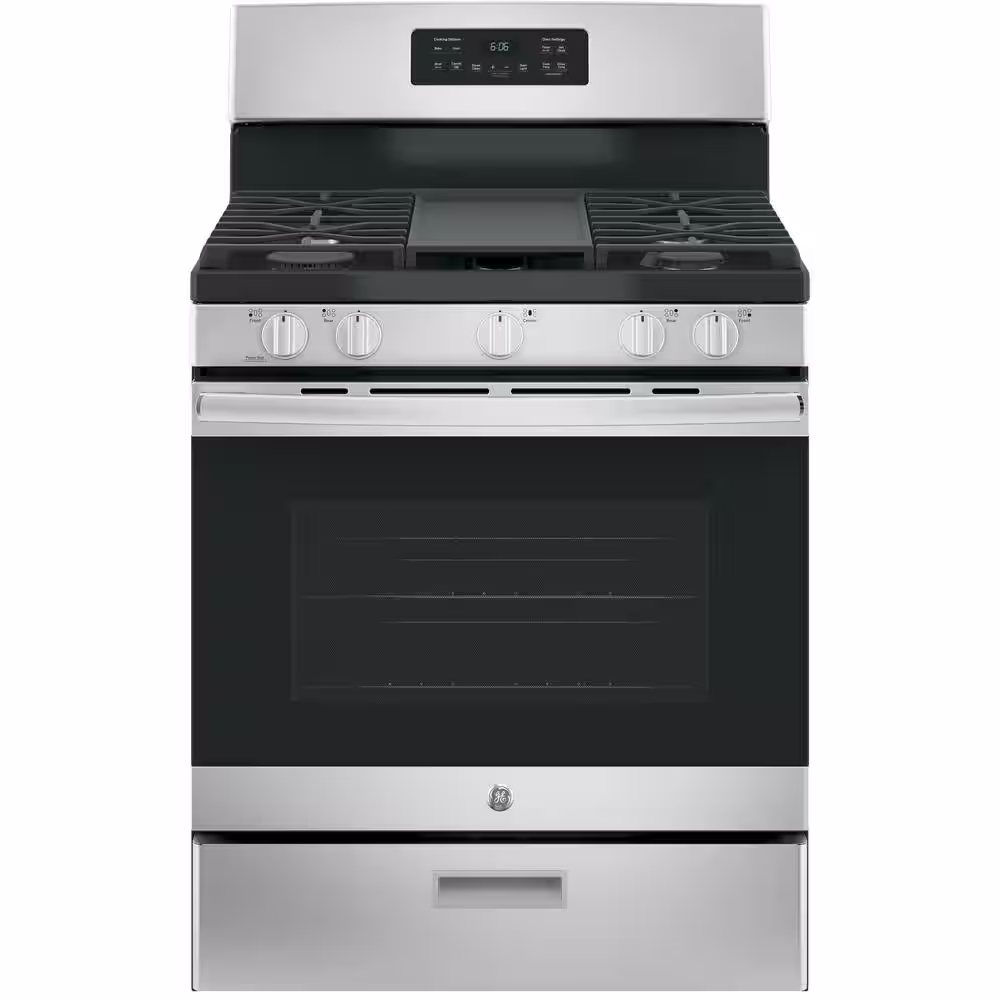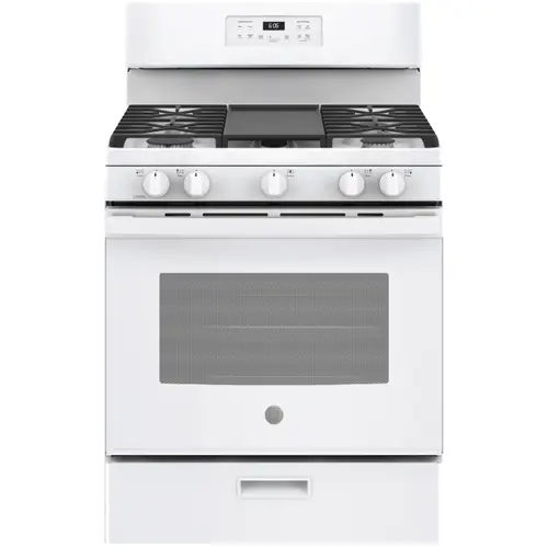 Ignition System Electronic Burner - Right Rear 12,000 BTU Oven Control Features Audible Preheat Signal, Auto Self Clean, Control Lock Capability, Delay Bake Option Oven Rack Features 2 Flat Nickel Racks, 6 Rack Positions Burner - Left Rear 5,000 BTU Precise Simmer Oven Cleaning Type Self-Clean Product Type Free-Standing Single Oven Cooktop Type Continuous Grates Cooktop Burner Grate Material Heavy Cast Iron Fuel Type Natural Gas (factory set) Interior Oven Light 1 Incandescent Control Location Front Cooktop Burner Grate Features Continuous Grates Control Type Electronic Touch Burner - Left Front 15,000 BTU Drawer Type