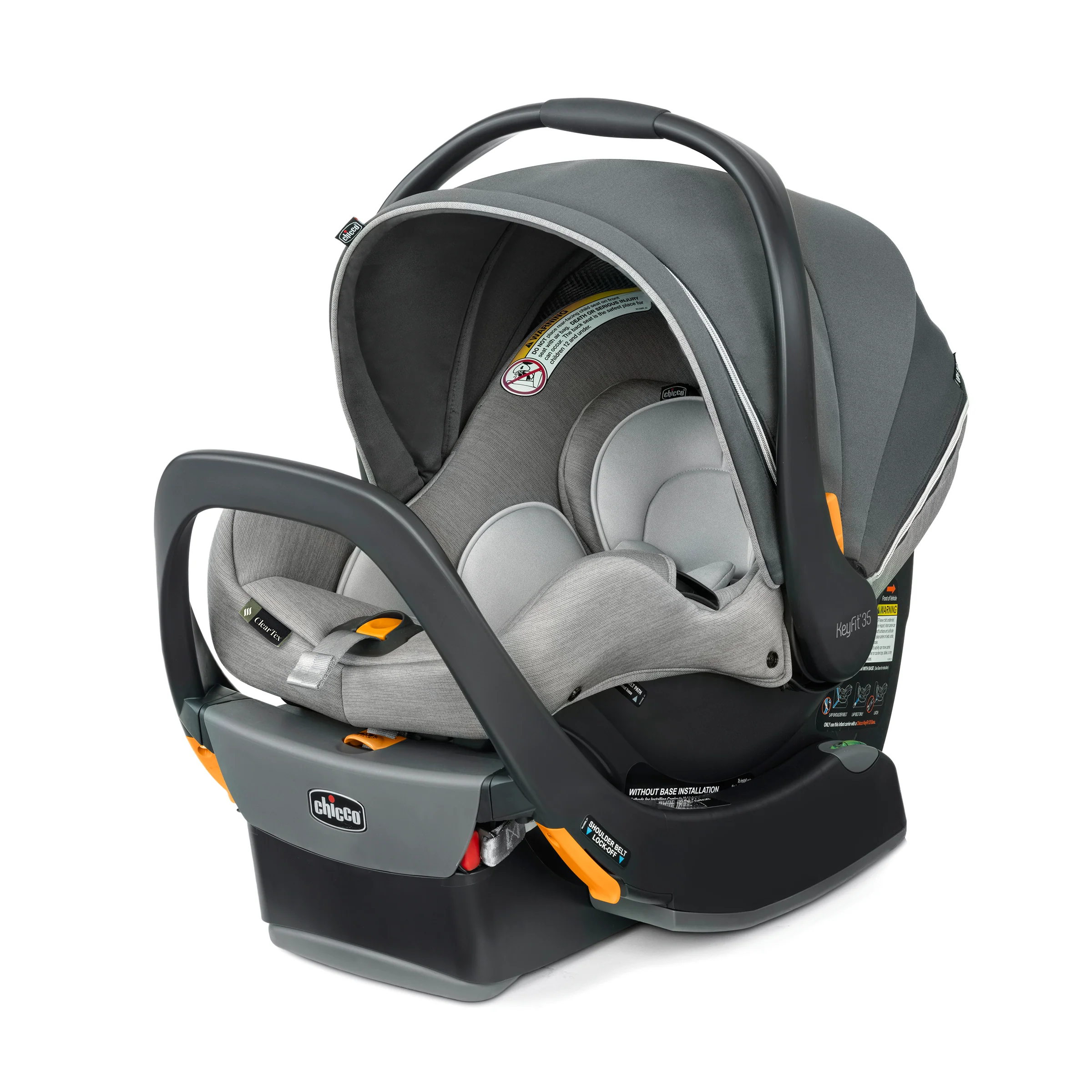 The KeyFit 35 Zip ClearTex Extended-Use Infant Car Seat from Chicco offers more headrest height & legroom for extended rear-facing use. It features no added chemicals and the breathable canopy includes a zip-extend, full-coverage privacy shield.