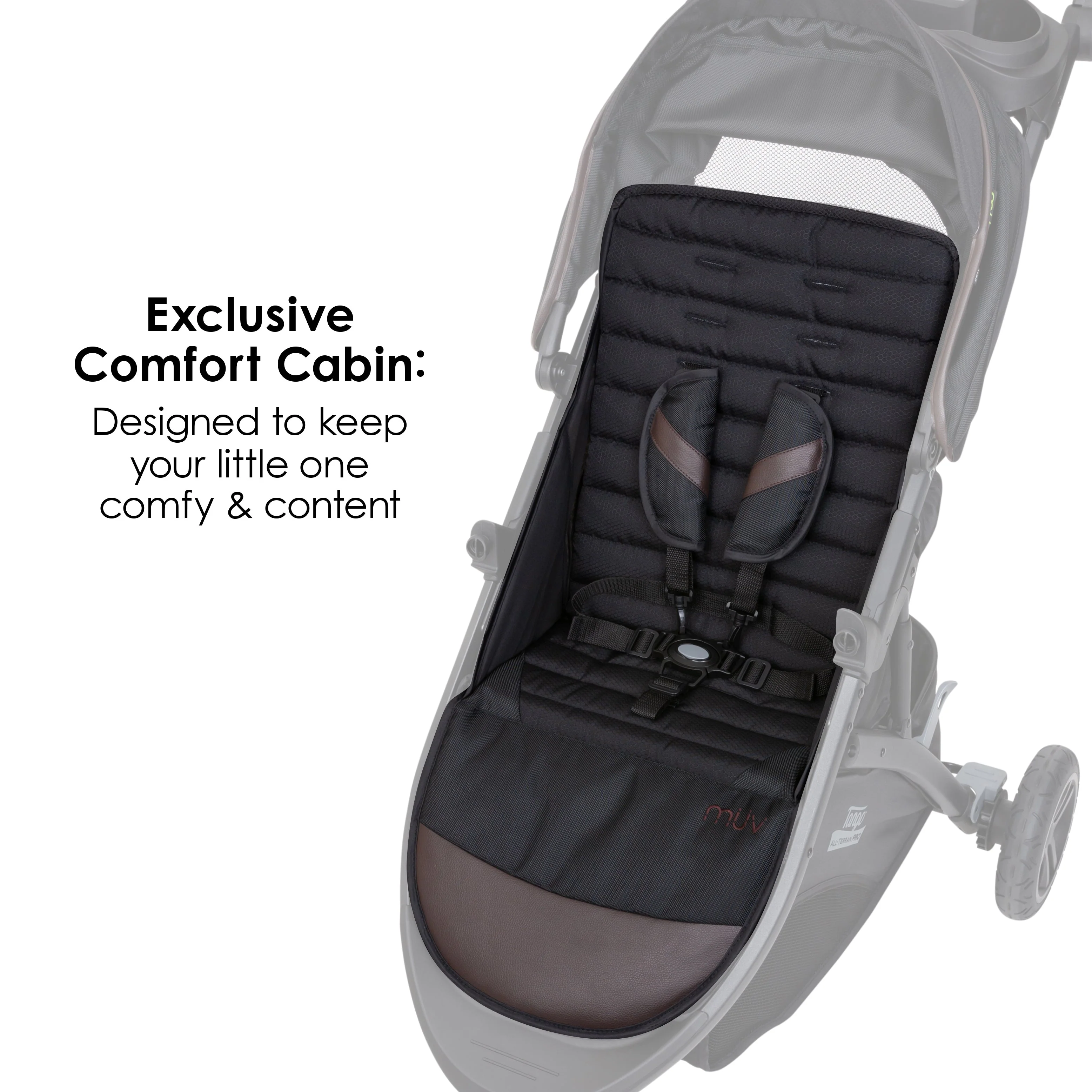- Exclusive Comfort Cabin: Includes UPF50+ canopy with visor, multi-layered seat with supportive padding and premium fabrics, five-point safety harness with premium harness covers, and dual suspension