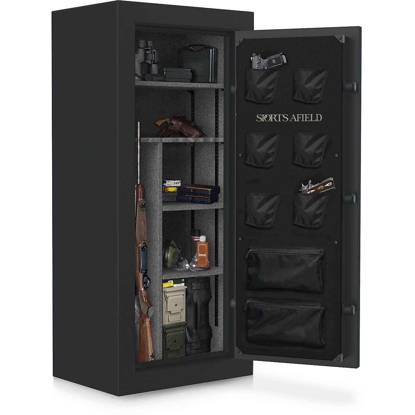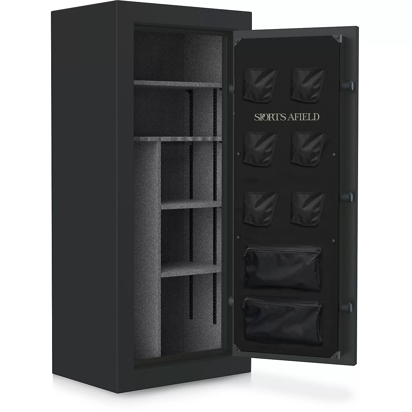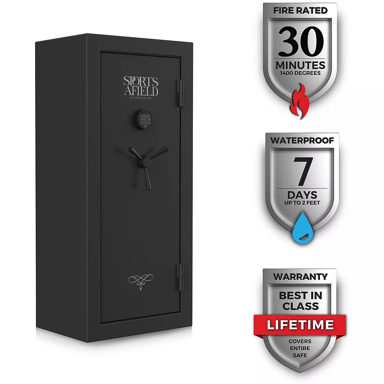 Keep your guns protected and away from danger with the Sports Afield 30-Gun Safe with Elock. The solid steel construction offers long-lasting dependability, and the five 1-inch solid steel locking bolts ensure secure concealment. This safe is fireproof and waterproof using Triple Seal protection, and the 4 predrilled bottom mounting holes allow you to stabilize the safe for safekeeping.