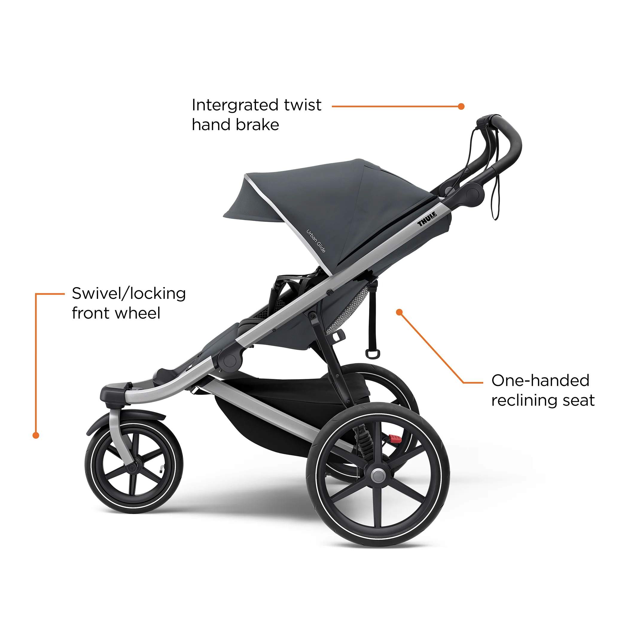 - Integrated twist hand brake provides speed control on hilly terrain