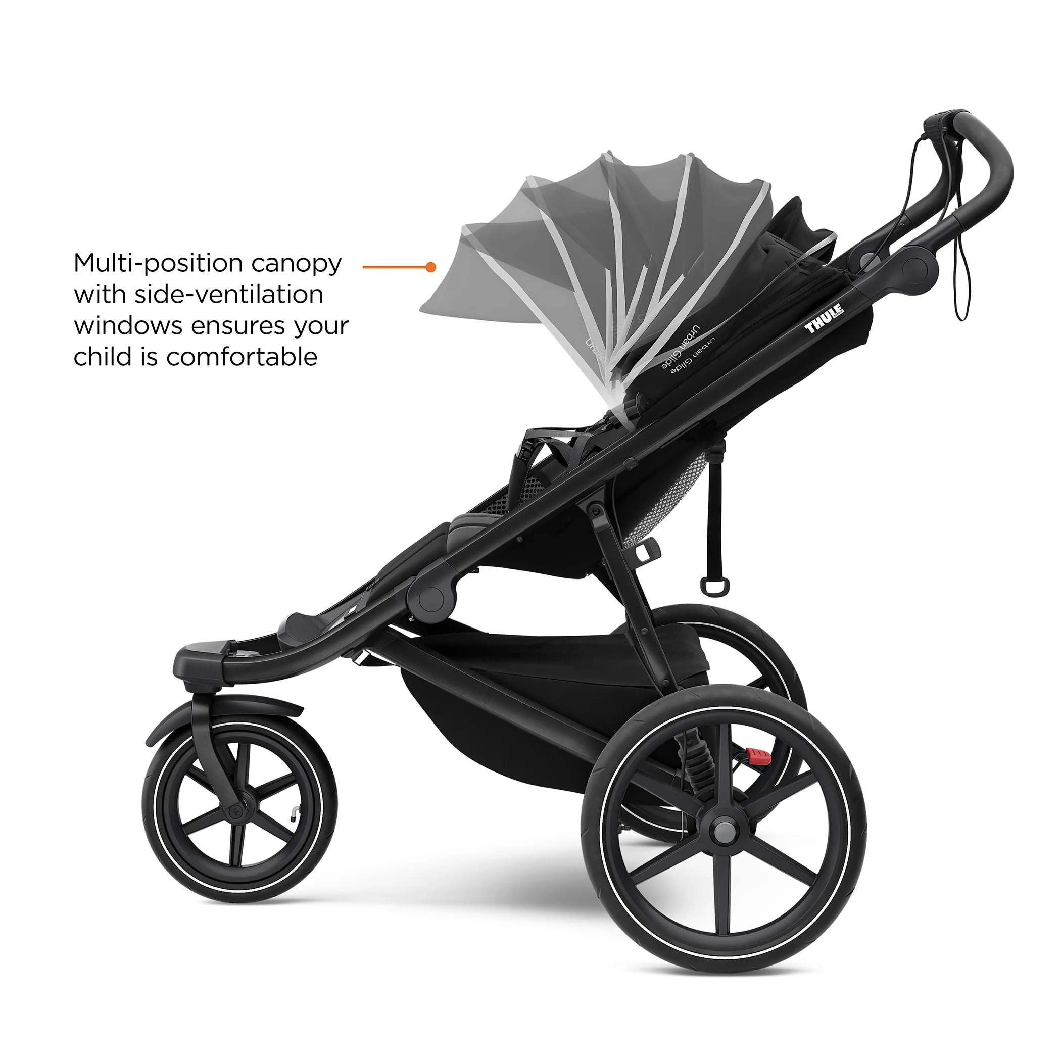 - Multi-position canopy with side-ventilation windows ensures your child is comfortable
