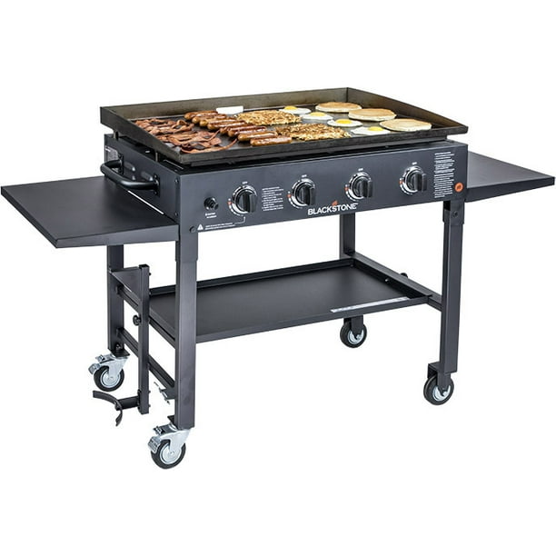 As the cornerstone of Blackstone Products our 36 Inch Griddle Cooking Station offers an expansive 36 in. x 21 in. 756 sq. in. cooking surface; easy assembly with a quick and easy ignition button; two cantilevered work surfaces and a bottom shelf to make food preparation convenient; easy to remove griddle top held stable by a stout steel frame and four industrial strength caster wheels 2 of which lock; thick cold rolled steel griddle cooking surface; steel frame powder coated in protective black; and four independently controlled 15000 BTU stainless-steel burners for a total of 60000 BTUs controlled low-to-high for versatile cooking options. We know you will love using our Blackstone 36 Inch Griddle Cooking Station this summer as much as we will!