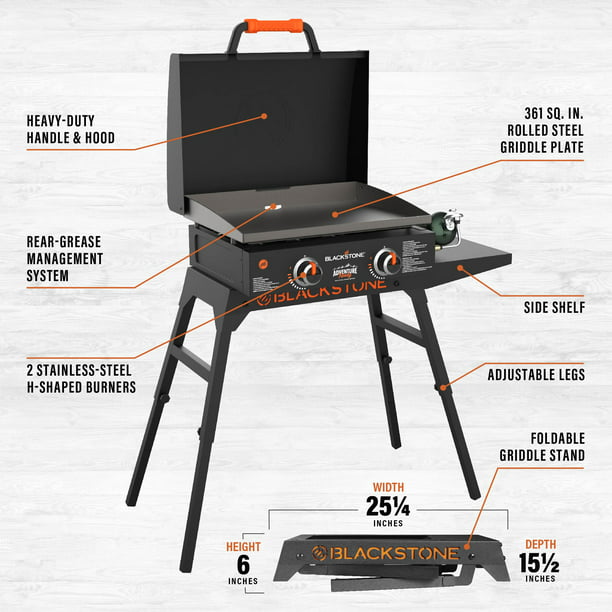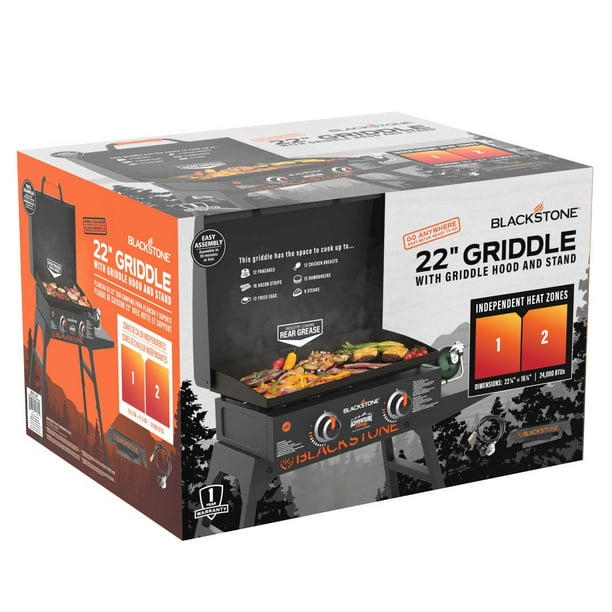 The Blackstone Adventure Ready 22" Propane Griddle with Hood, Legs, and Bulk Adapter Hose is the ideal package. Combine the already great tabletop griddle with a folding stand and this griddle will cook anywhere, any time of the year! A hood with a non-slip grip protects your griddle surface and traps 24,000 total BTUs of heat when grilling, no matter the location. With an included adapter hose, you can connect a 20-pound propane tank to your griddle, perfect for long hunts, fishing expeditions, or family camping trips. With 361 square inches of cooking space, this unit will cook burgers, hot dogs, steaks, eggs, pancakes, and much more. Dual H-syle burners evenly distribute heat across the griddle surface in two separate cooking zones, giving you ultimate control. This ultimate combination of Blackstone is sure to bring good food and memories to everyone!