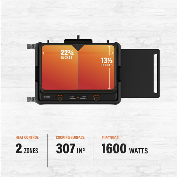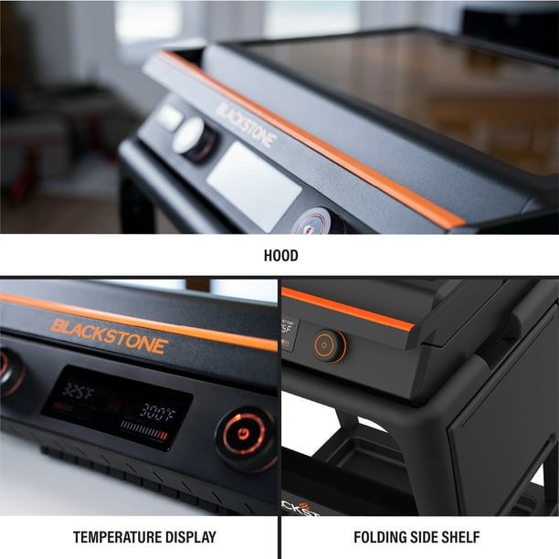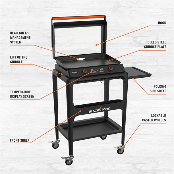 Introducing the Blackstone E-series 22 Electric Tabletop Griddle with Hood. Featuring Blackstone's traditional quality and style this griddle brings indoors what once was strictly for the outdoors. Simple and elegant in design this griddle has a wheeled cart that gives you the flexibility to decide if it will decorate your countertop or adorn the patio. A clean-catch low profile rear grease management system that is dishwasher safe means you'll never have to worry about clean-up. The removable hood with a glass top is perfect for watching your food sizzle while preventing grease splatters. An EZ-Touch dial and a large LCD display help you control the temperature of the machine cast griddle plate with a non-stick ceramic-titanium coating. With 312 square inches of cooking space and two variable temperature zones you'll create delicious and savory meals for breakfast lunch and dinner. What will you cook on your new electric Blackstone