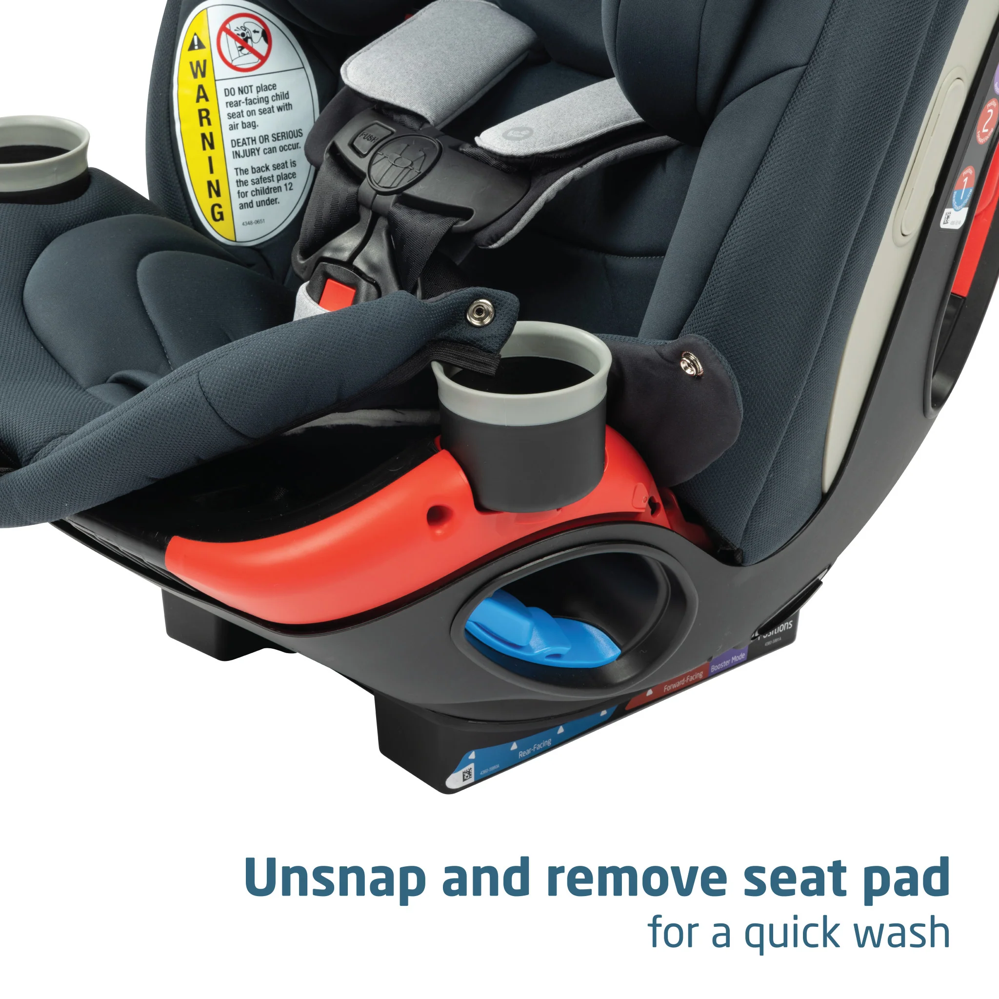 • Unsnap and remove the seat pad for a quick wash, and easily route the belt in rear-facing mode.
