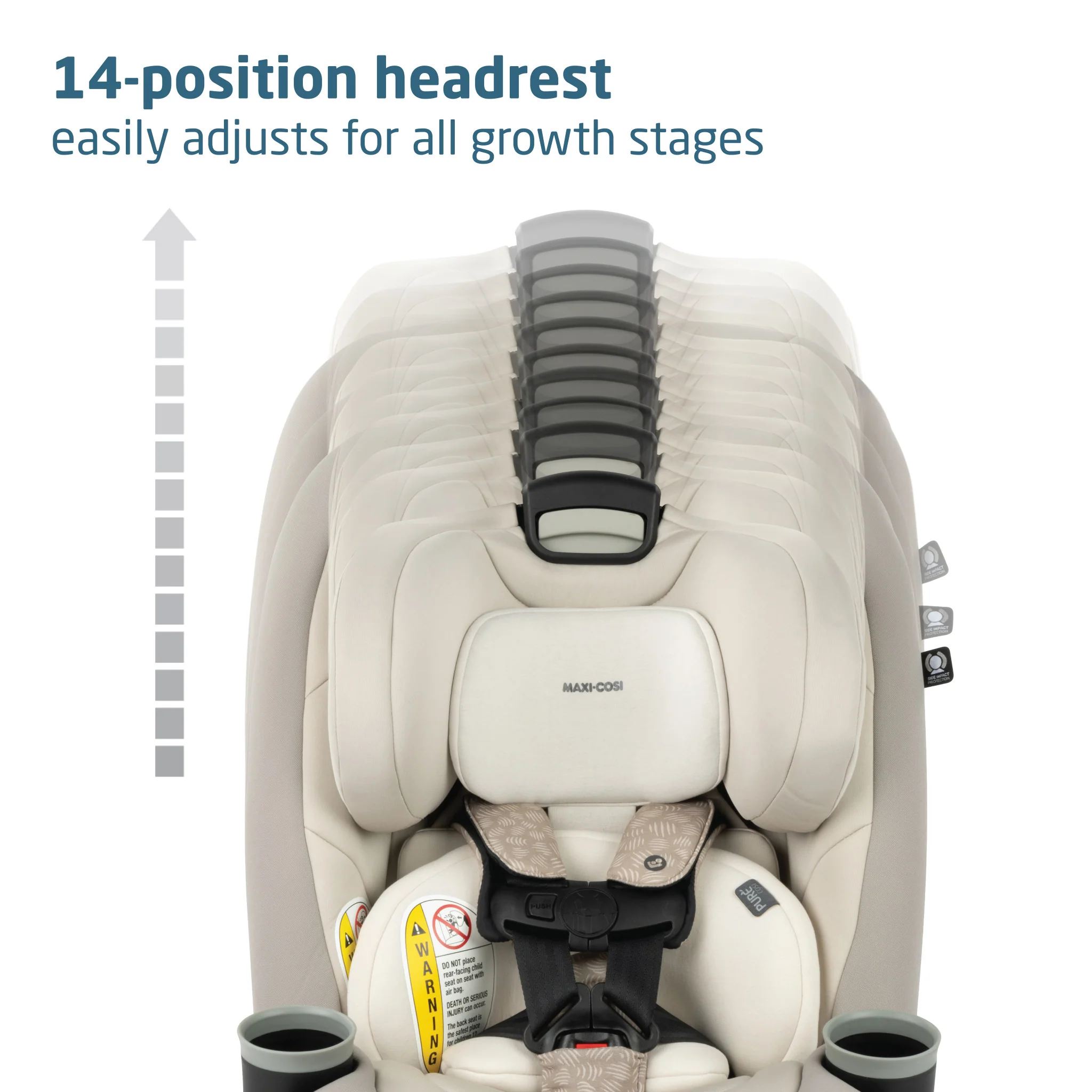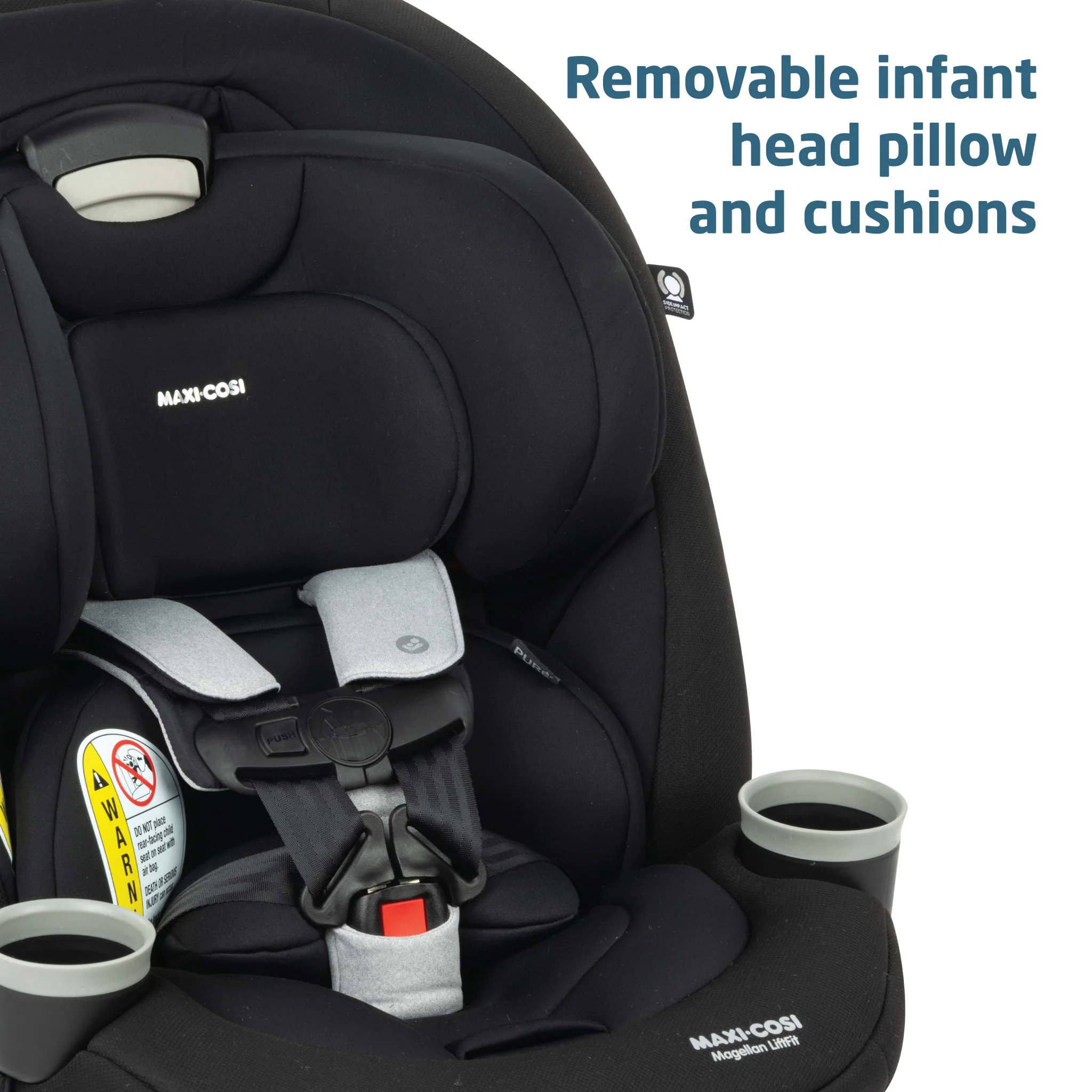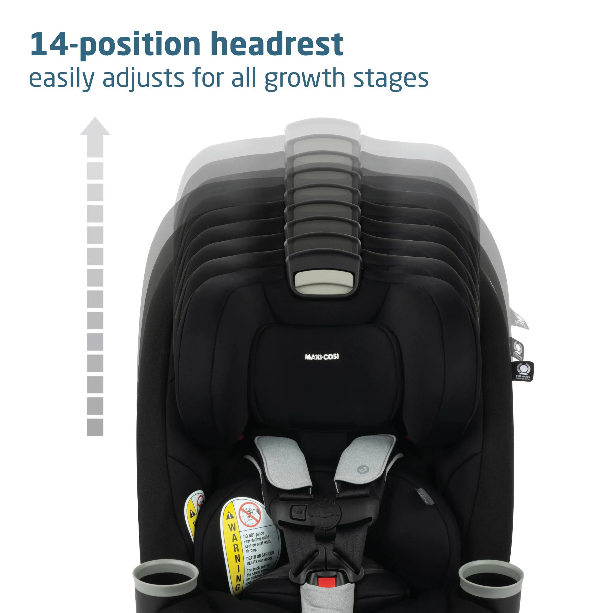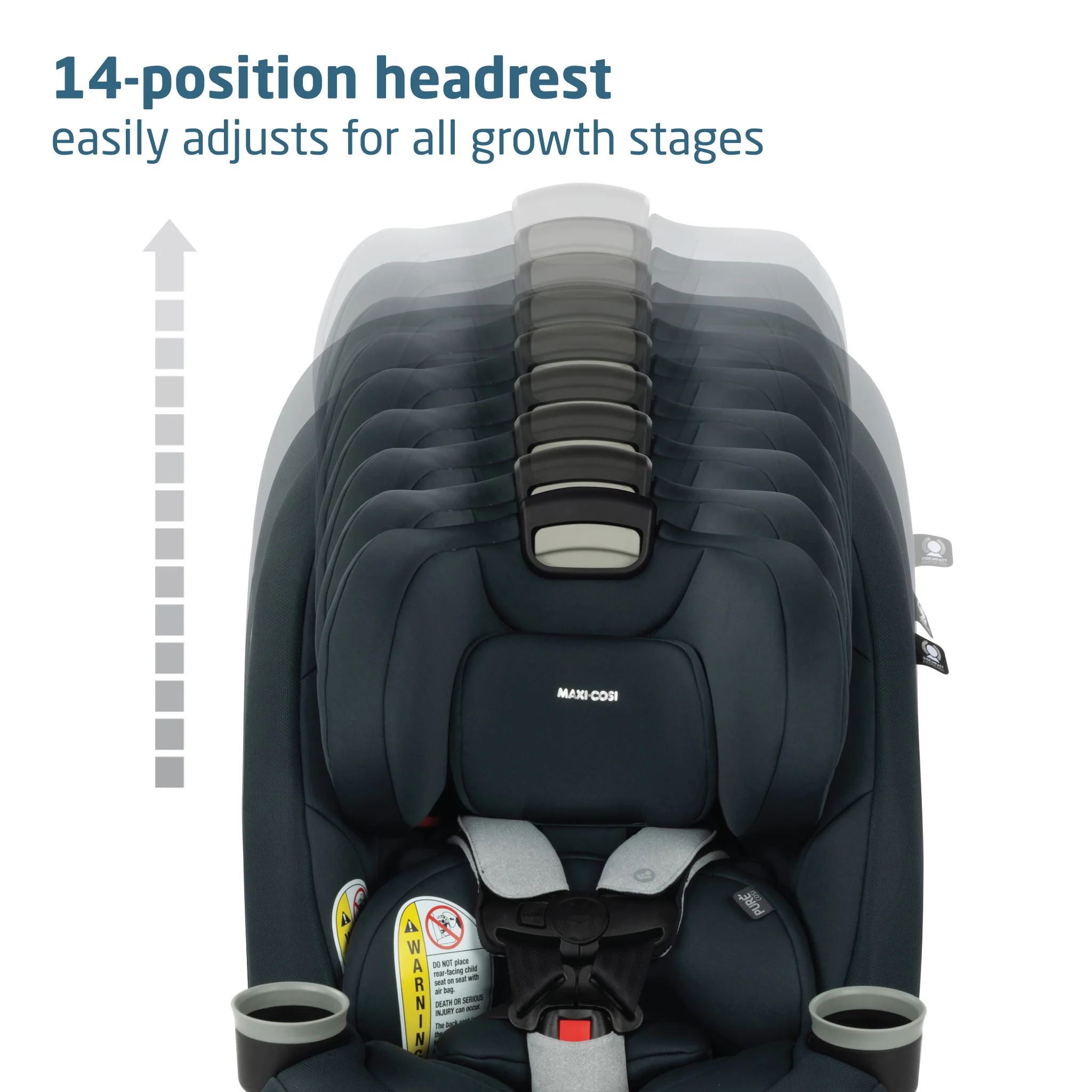• Side impact protection is built into the headrest to cushion an impact and provide a soft pillow of comfort for your child.