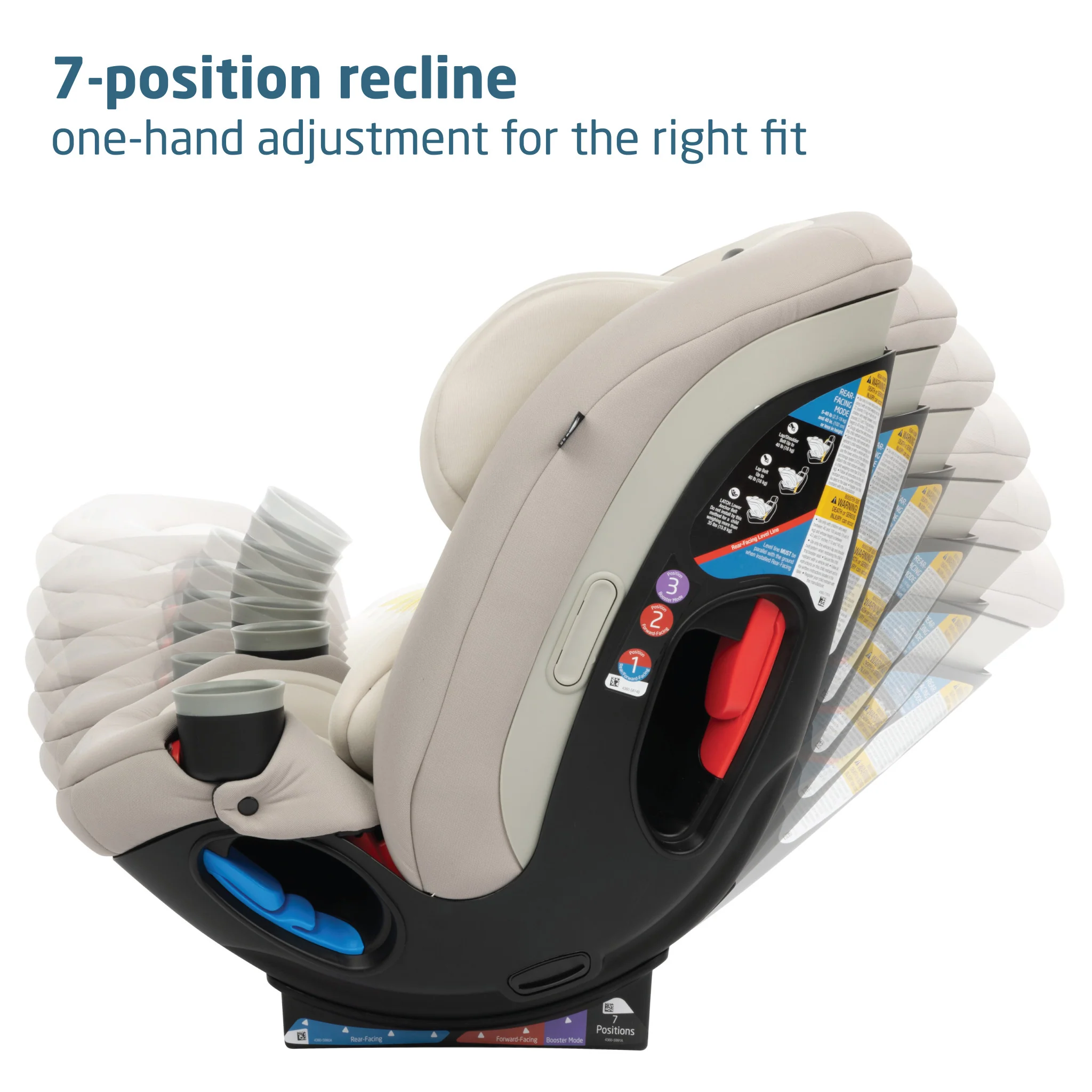 • Easily transform the seat to booster mode with the Hideaway Harness. Integrated belt lock-offs for easy and secure installation, and one-click LATCH connectors install and release easily.