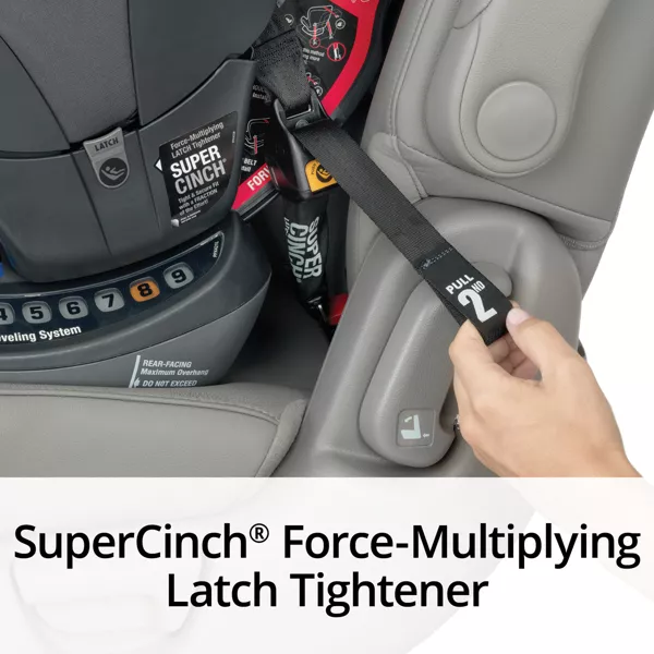 - Force-multiplying SuperCinch® LATCH tightener helps achieve a tight and secure fit with a fraction of the effort
